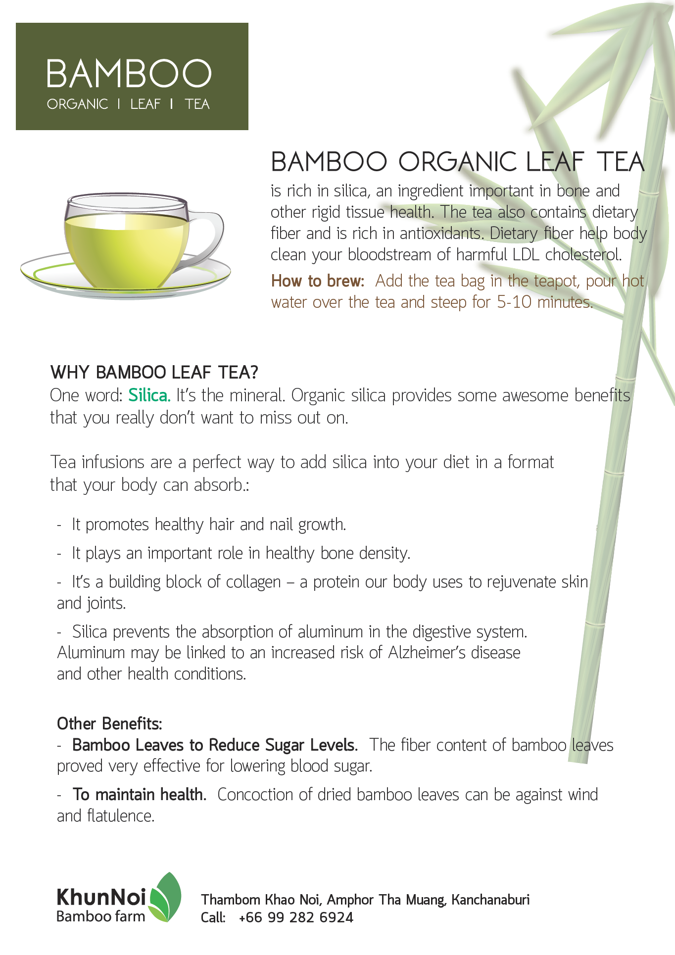 เป็นชาสมุนไพรดื่มเพื่อสุขภาพ รสชาติหวานหอมอ่อนๆ ช่วยสร้างสมดุลให้ทั้งจิตใจและร่างกาย ไผ่เป็นพืชมีปริมาณซิลิกาสูงที่สุด ซิลิกาเป็นสิ่งที่ช่วยให้ไผ่เติบโตอย่างรวดเร็วและแข็งแรงและยังคงความยืดหยุ่น ชาใบไผ่มีเส้นใยที่ละลายน้ำได้และอุดมไปด้วยสารต้านอนุมูลอิสระที่เป็นประโยชน์ต่อร่างกาย ดื่มได้ทุกเวลา ปราศจากคาเฟอีน เหมาะสำหรับผู้รักสุขภาพ ดื่มได้ทั้งแบบร้อนและเย็น